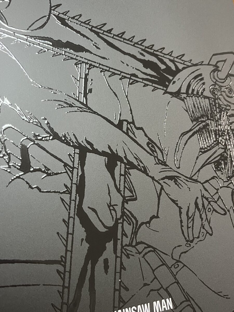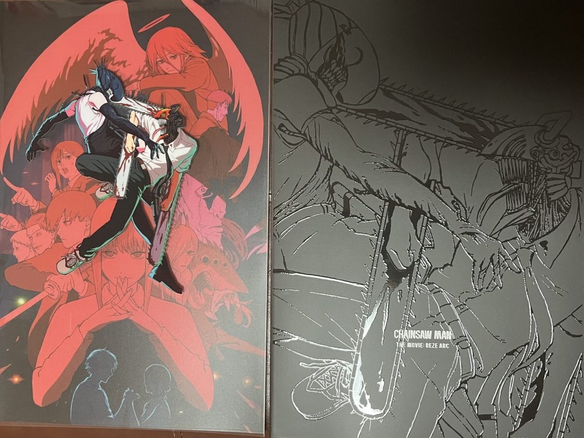 パンフレットは、黒のマット紙にニス引きのボムとチェンソーマンのイラストが。それにクリアカバーがついていて、そこにもアニメのセル画みたいにイラストが載っています。そして、本を抜くと背景のカラーイラストと合体してポスターのイラストのようになります!装丁も工夫されていてかっこいいですね。