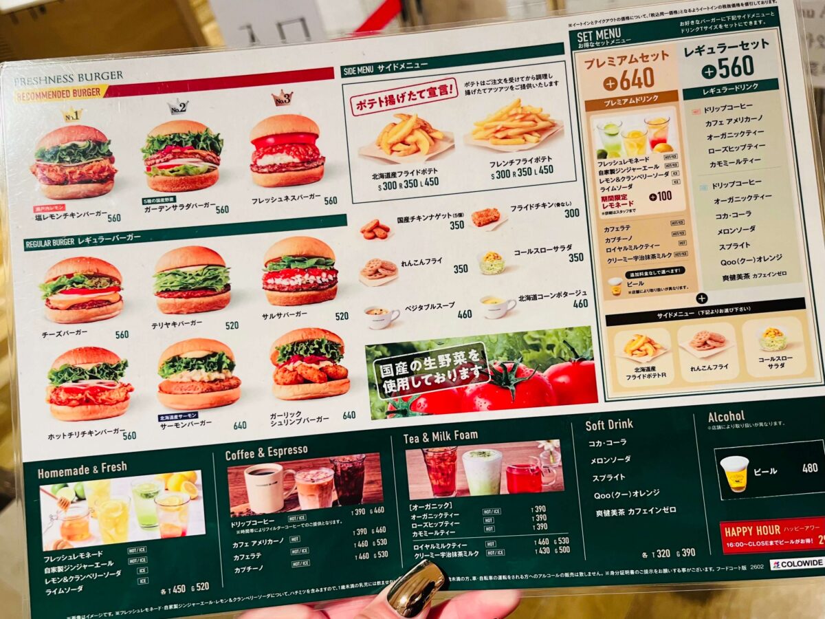 セットにしようと思うと、バーガーの料金+サイドとドリンクのセット料金な感じで、セットで購入しようとすると少し割高感はあり。オーガニック系ドリンクが結構ありましたね。蓮根フライとか、他にはなかなかないサイドメニューもちょっと魅力的〜ではありましたが、子連れなので割安でオーソドックスな感じの注文にしておきました。笑