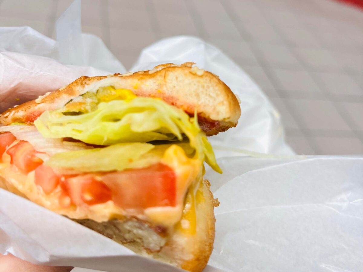 チーズバーガーはオーソドックスなチーズバーガーと違い、レタスやトマトなどの野菜がしっかり入っていてヘルシー感あり◎てりやきはレタスがそんなに多くないかな〜って感じ。モスの方が多いかな。子どもが食べるからハーフカット(半分にカット)してもらったので、断面図ですが、バンズが黄色でなんでだろ?と思いつつ。