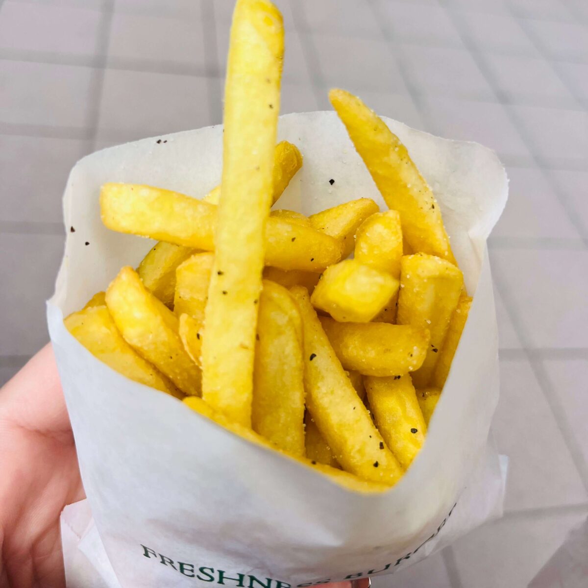 ポテトは細めと太めがあって、好みによって注文できるのがいいですね。細めの方を選びましたが、胡椒?がかかってるのかな。オシャレな感じのポテトでした!