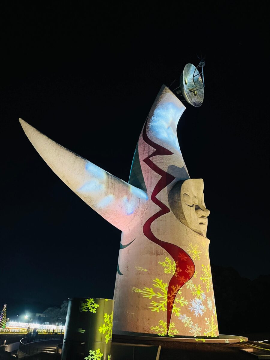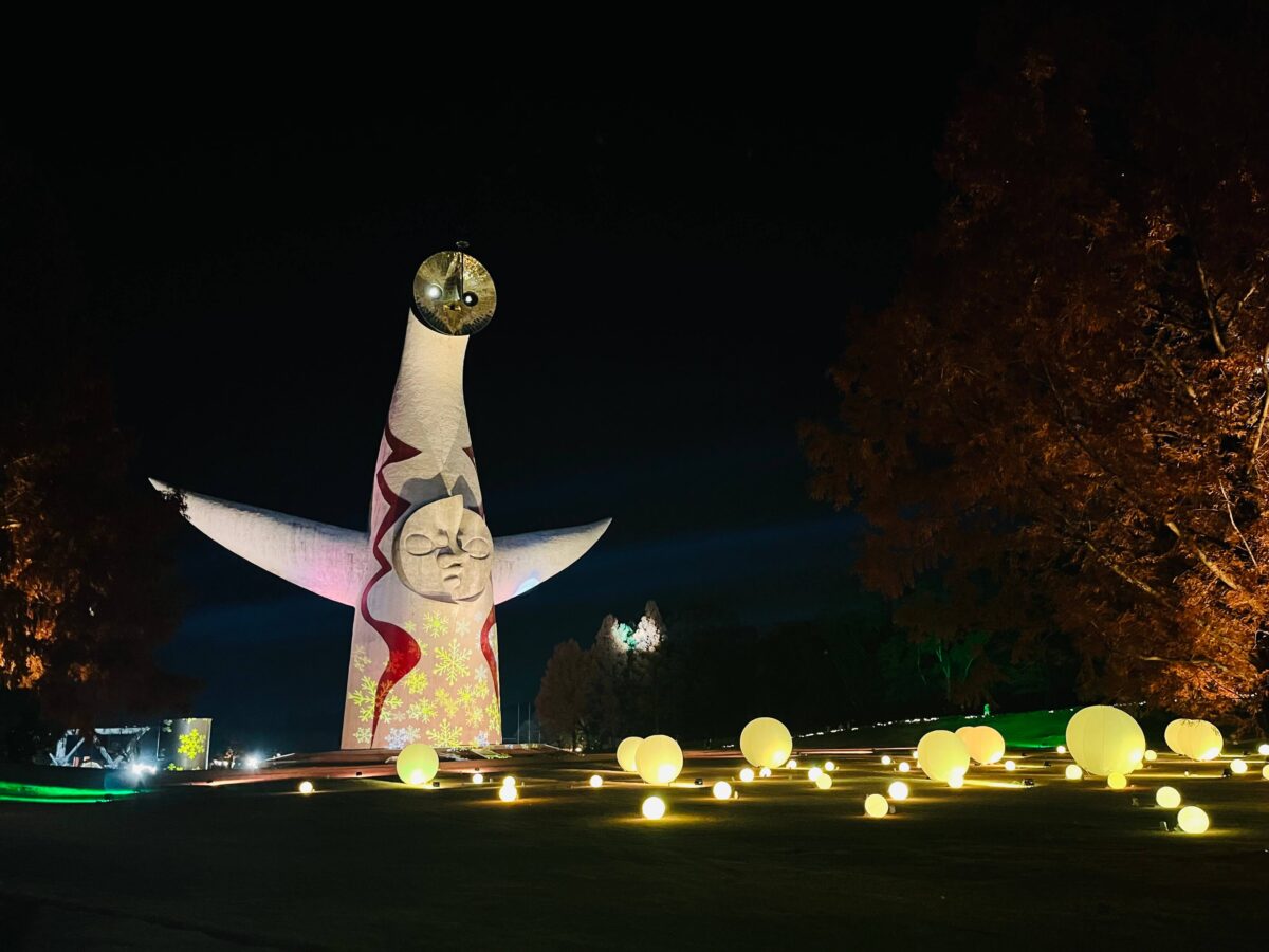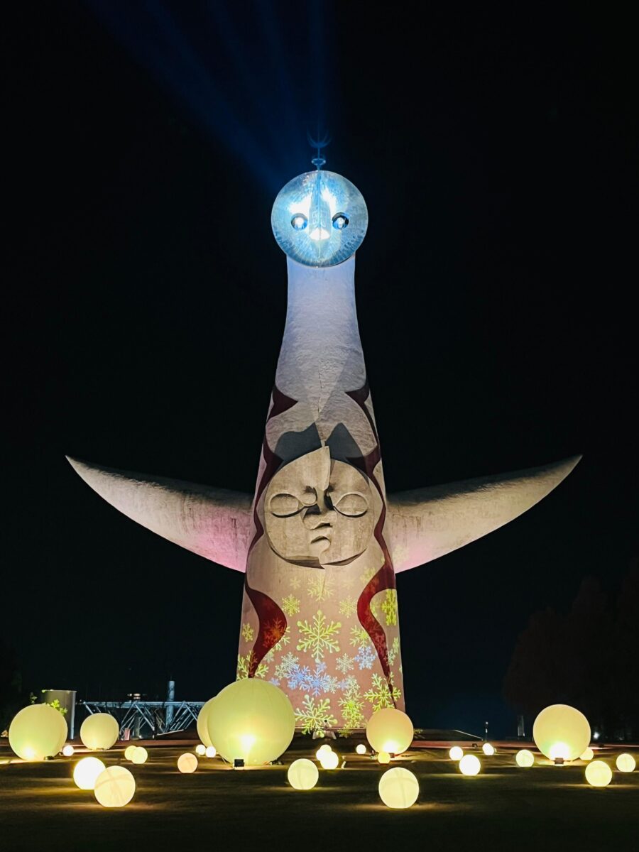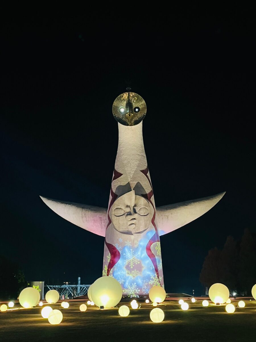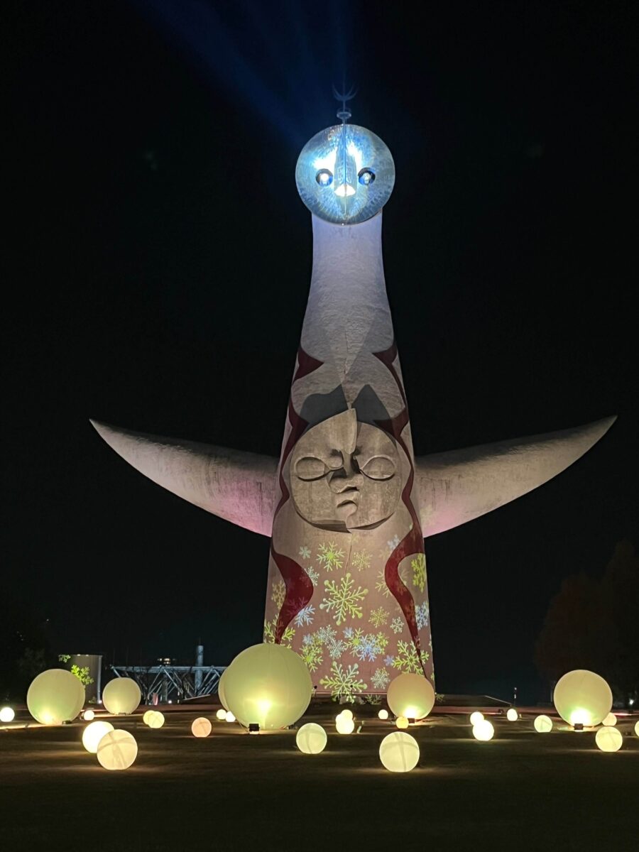 ライトアップされた太陽の塔は昼間とはまた違った雰囲気を楽しめました。ただ、思ったよりはイルミネーションの範囲とボリュームが少なかったかな?と思います。テーマカラーがシャンパンゴールドなので、あまり色がないからそのせいもあるかもしれません。
