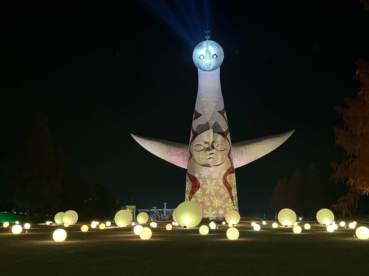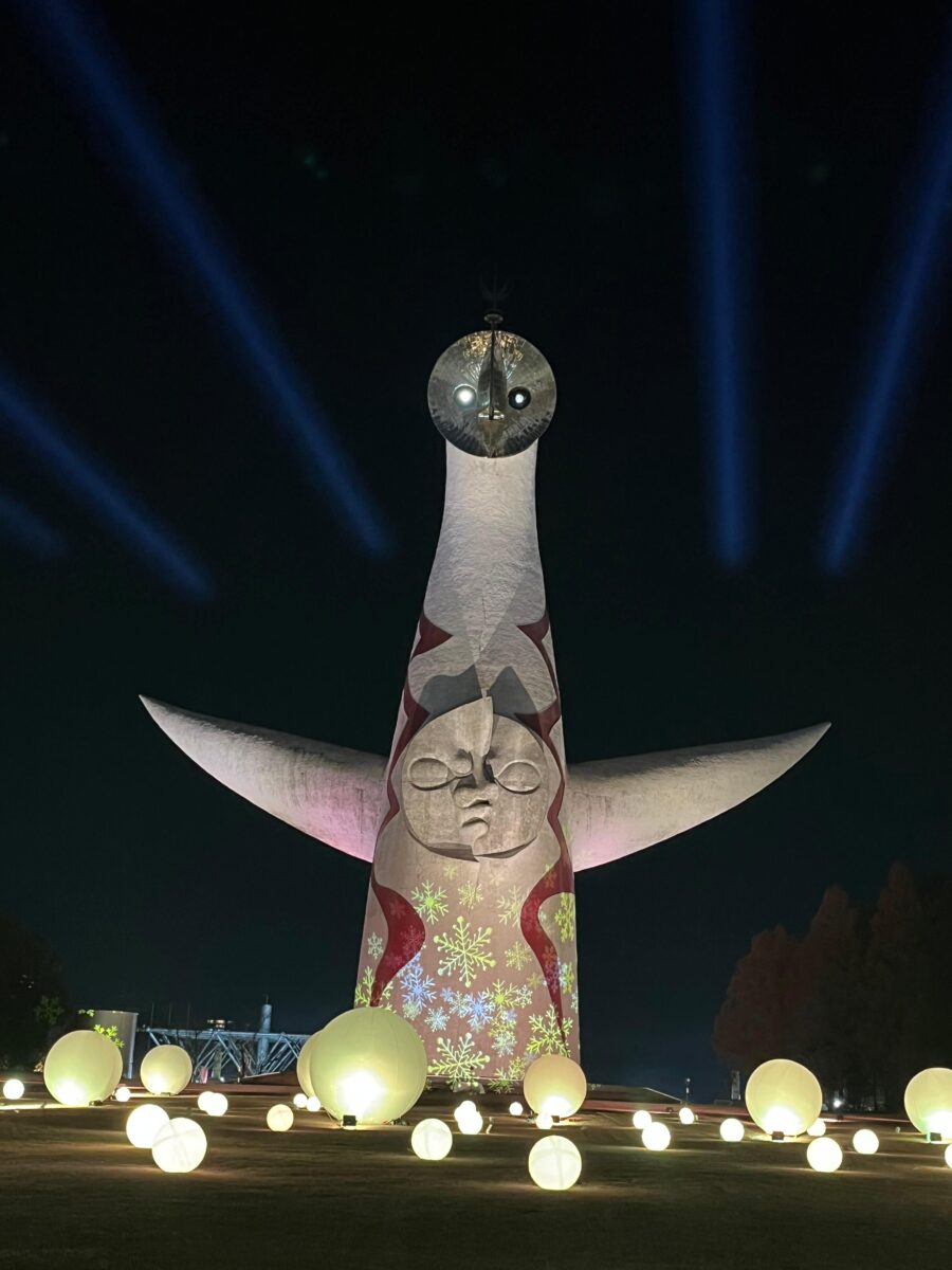 イルミナイト万博〜2025WINTER〜は、万博記念公園内の太陽の塔とその周辺で行われるライトアップイベントです。太陽の塔にプロジェクションマッピングで装飾が施され、光って綺麗でした。2025年のテーマカラーは「シャンパンゴールド」。柔らかな金色のイルミネーションが、公園全体を暖かく包み込みます。