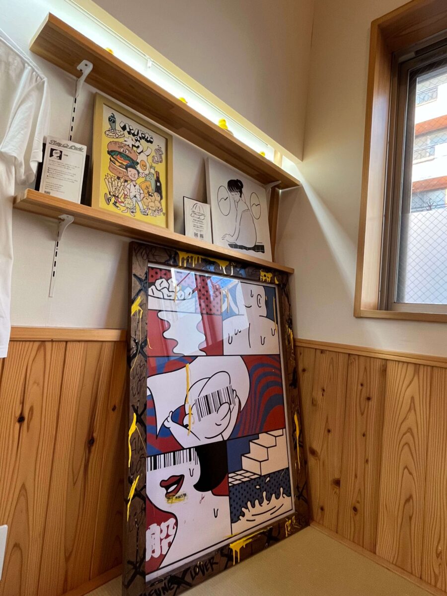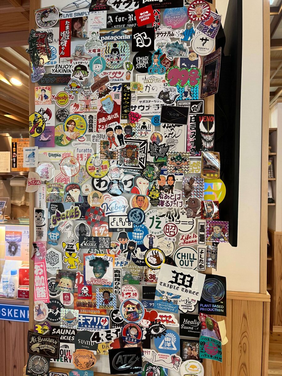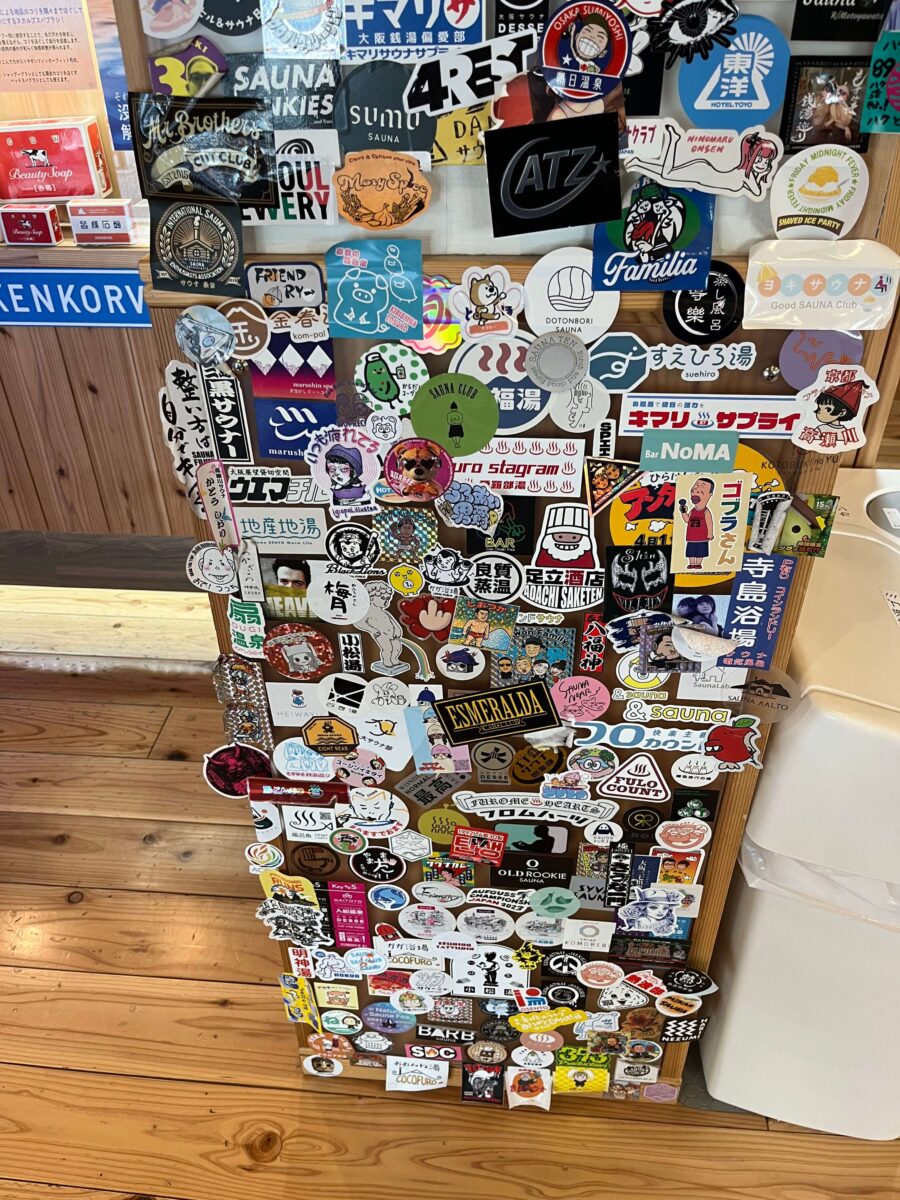 ステッカーだらけの壁もありました。大阪の公衆浴場はほんと銭湯多いですね〜奈良には無い。