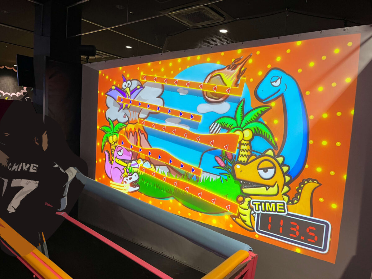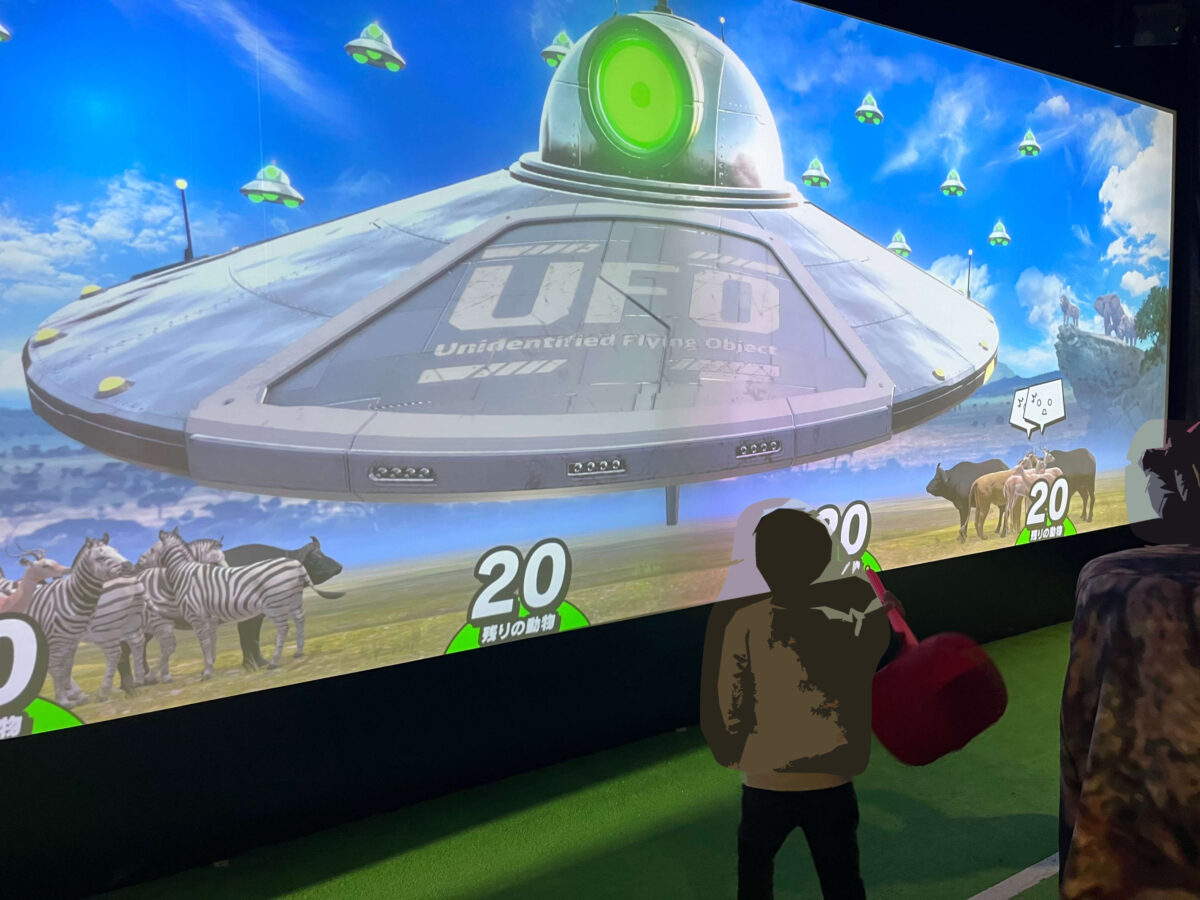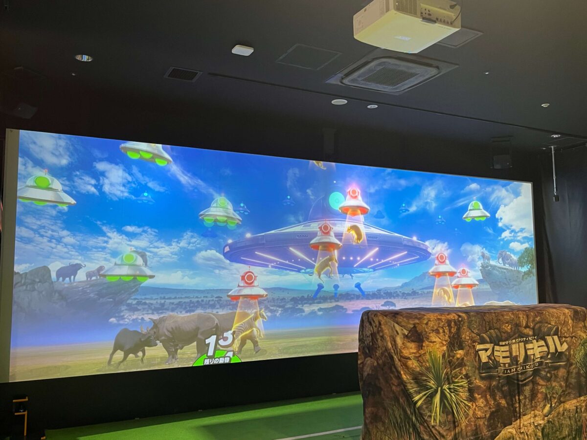 関西ではこの店舗が初の「マモリキル」はスクリーンに映し出される猛獣たちを、連れ去られるUFOから守るゲーム。ハンマーなどで宇宙人を「討伐」する新感覚アクティビティ。数が多いから、かなり動き回る必要があって、ハンマーで叩く動作や途中で逃げたりする必要もあり終わると汗だくになりました。笑