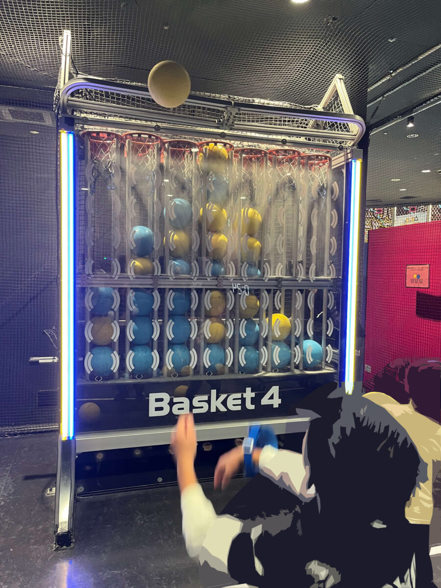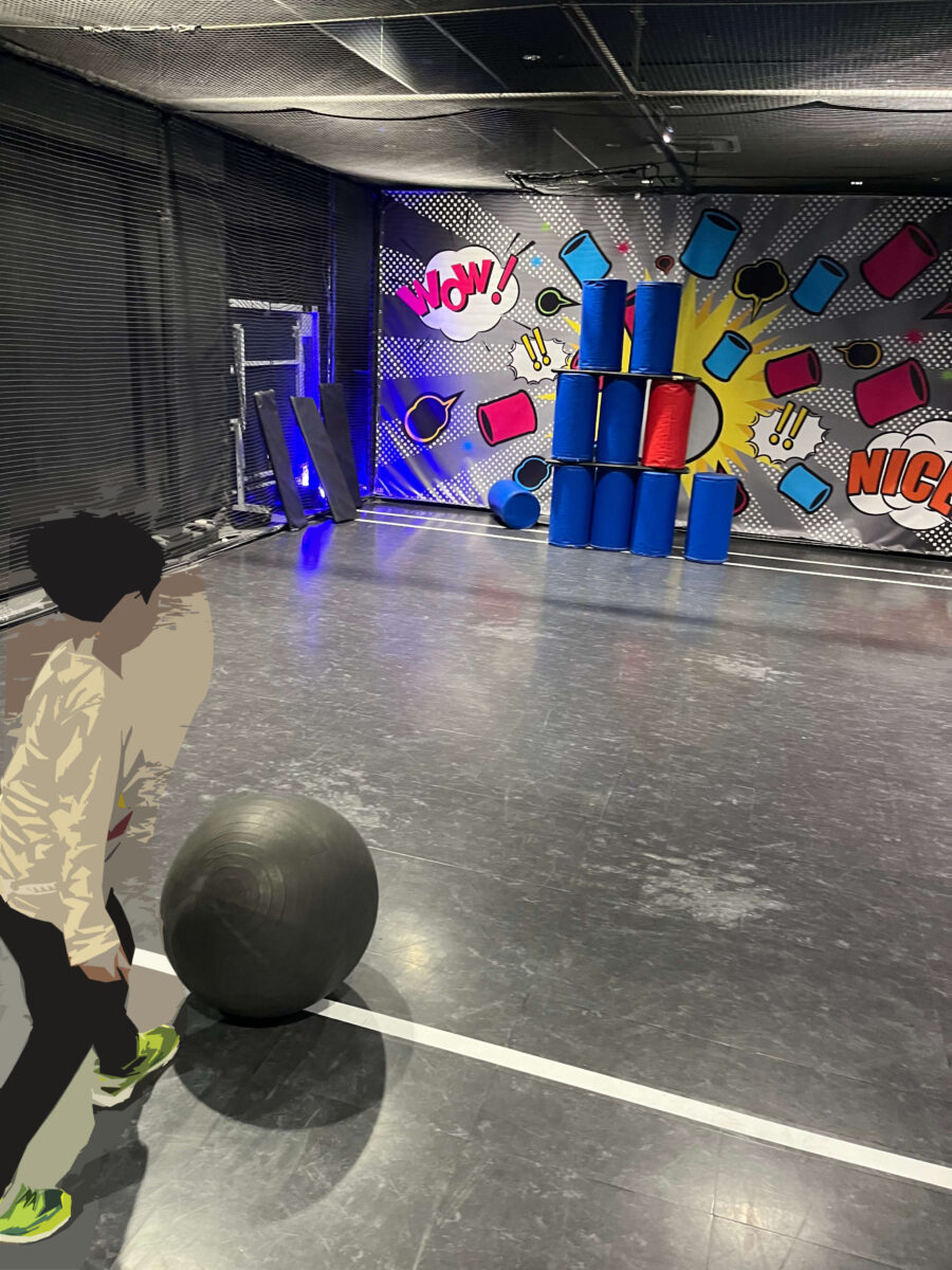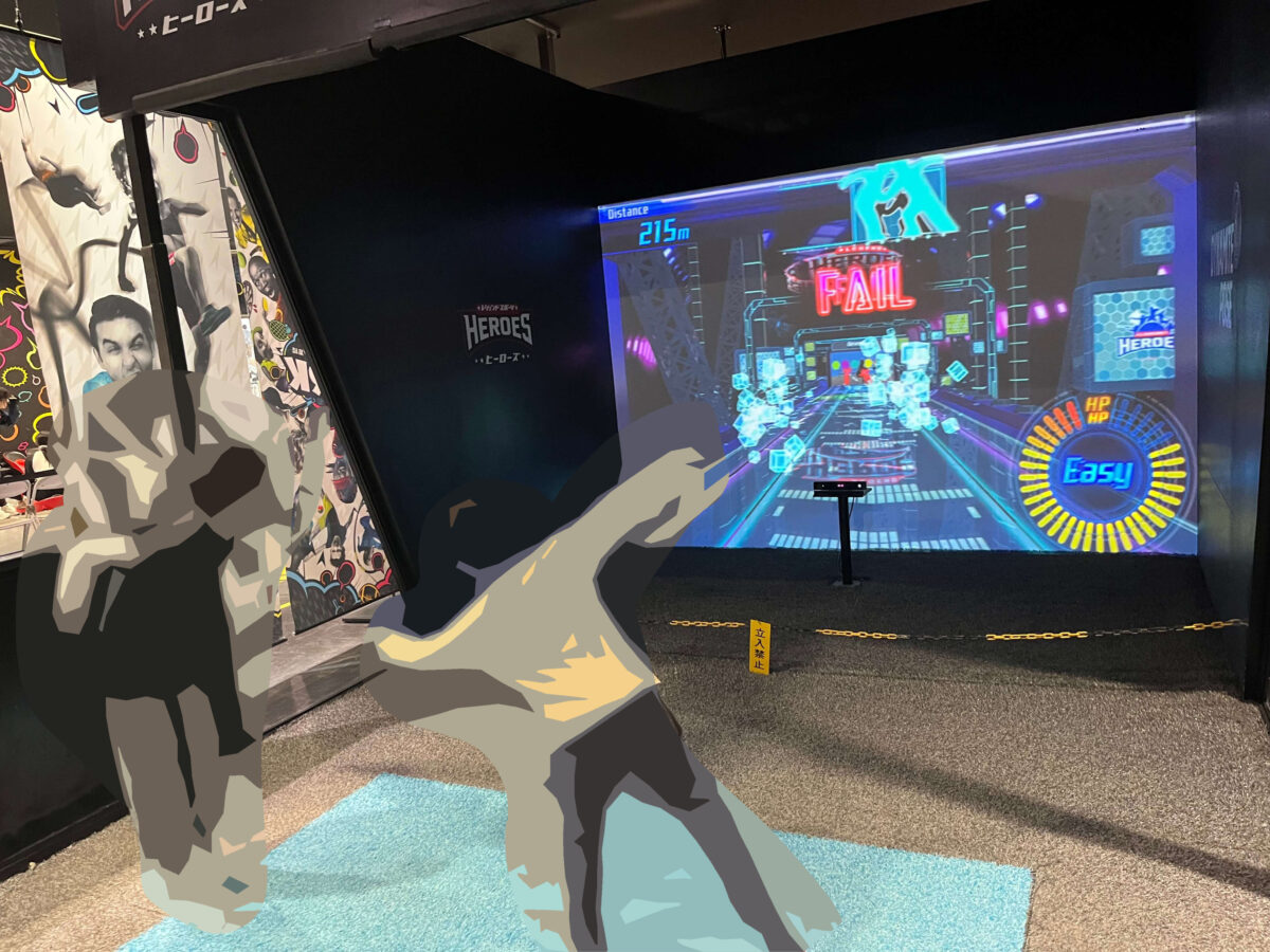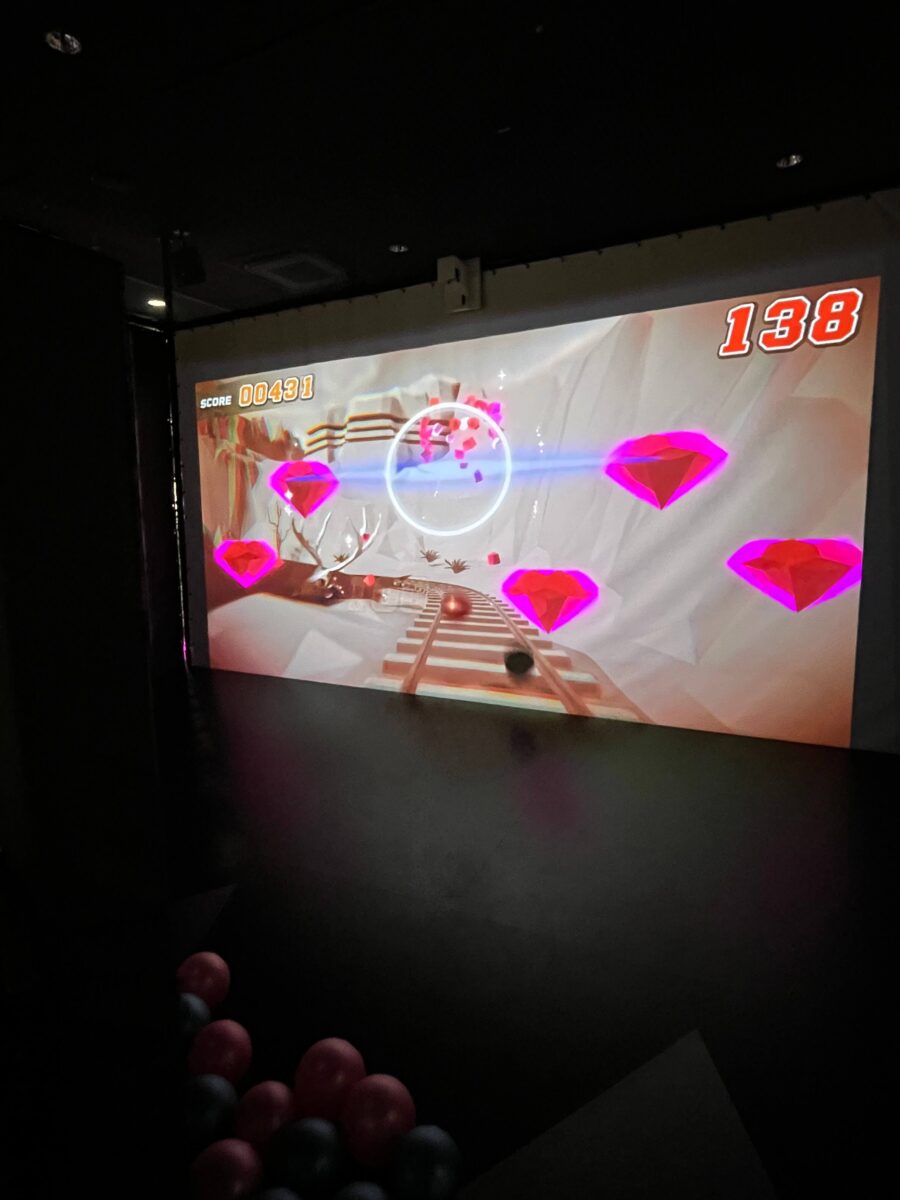 関西ではこの店舗が初の「マモリキル」はスクリーンに映し出される猛獣たちを、連れ去られるUFOから守るゲーム。ハンマーなどで宇宙人を「討伐」する新感覚アクティビティ。数が多いから、かなり動き回る必要があって、ハンマーで叩く動作や途中で逃げたりする必要もあり終わると汗だくになりました。笑