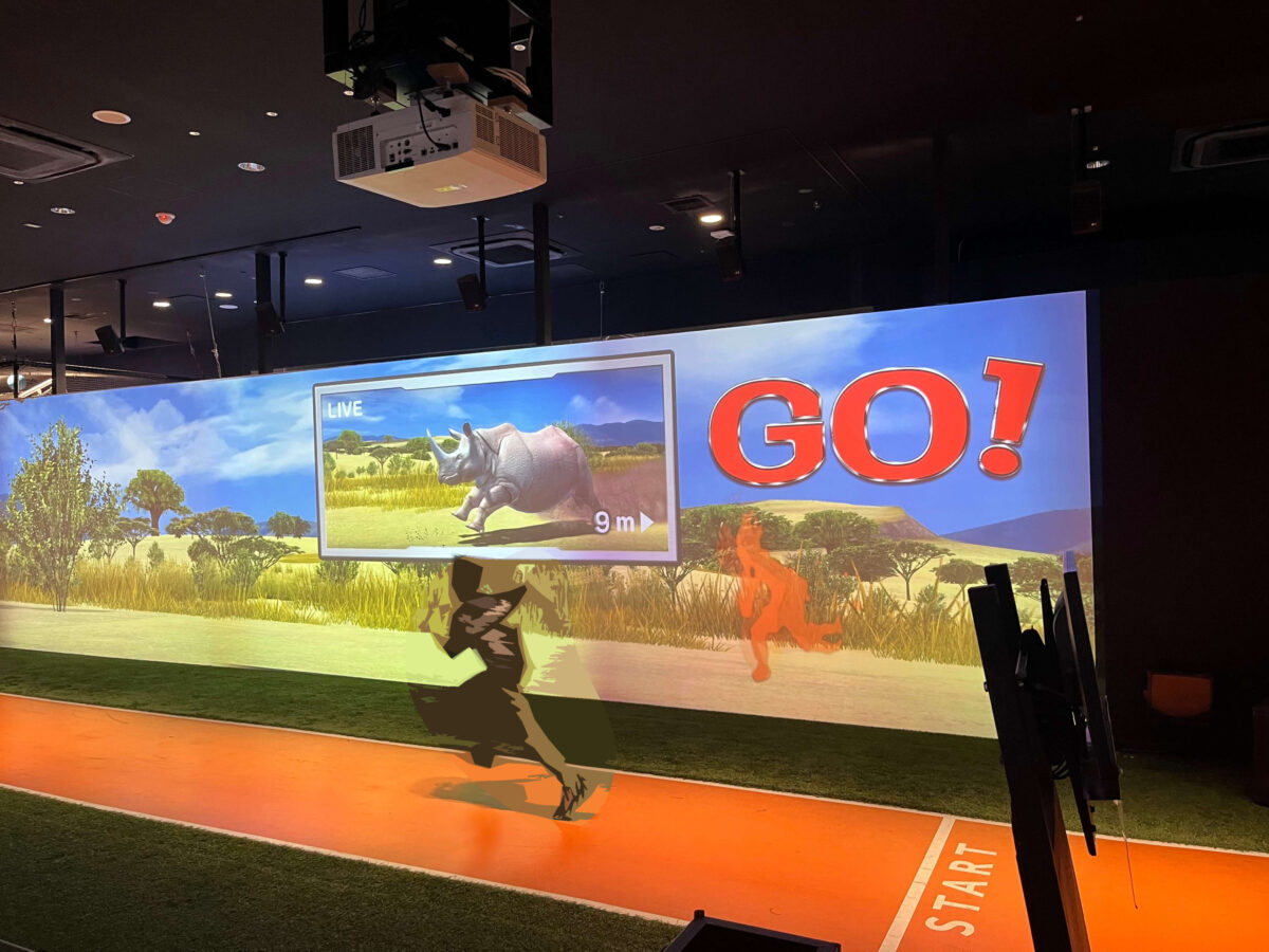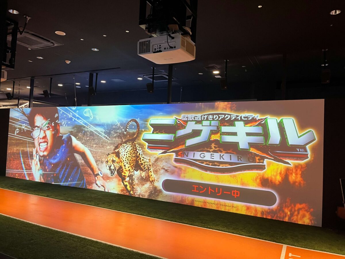 最後に、エントランスすぐにあった「ニゲキル」を体験。猛獣と走りで対決!!好きな動物や恐竜などから対戦相手を選び、猛ダッシュして逃げ切れたら成功!というゲーム。ギリギリ追いつかれてしまって悔しがっていました。